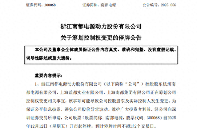 12月11日晚间,南都电源公告,公司于近日收到公司控股股东杭州南都电源有限公司、上海益都实业有限公司、上海南都集团有限公司通知,获悉其正在筹划控制权变更、促进再生铅板块股权出售的相关事宜。公司股票自12月12日开市起停牌,预计停牌时间不超过2个交易日。