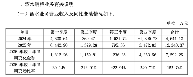基于谨慎性原则,*ST春天在2024年第四季度将可能产生质疑的酒水业务收入调减6810.76万元,调整后账面收入为-1390.73万元。*ST春天表示,这一结果是会计审慎处理的体现,不能代表当期真实经营水平。调整前,2024年第四季度实际发货额为5420.03万元,以此口径对比,2025年第四季度确认收入的金额同比有所下降,与行业整体趋势一致,因此2025年同比大幅增长主要是统计层面的基数效应,而非经营业绩的实质性跃升。