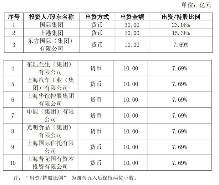 目前,上海国茂股权结构为:上海国际集团有限公司出资30亿元,持股23.08%;上港集团出资20亿元,持股15.38%;东方国际、光明食品等其他多家上海市国资监管企业或其指定主体合计出资80亿元,持股61.54%。