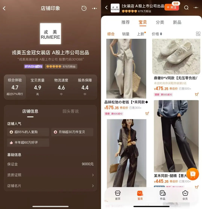 戎美女装的主要销售渠道是其淘宝店铺(销售收入占比99.9%),该店开业近20年、累计678万粉丝。戎美的主流商品价格分布在100-2000元之间,定位中高端女装。店铺页面显示,该店月销超30万件宝贝,半年超60万好评。2021年10月,戎美在A股上市,被称“淘系女装第一股”。