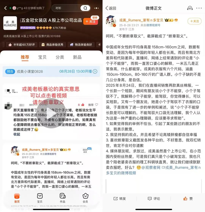 这番回应消费者疑惑的言论随后快速出圈,被指“冒犯”“不尊重”。董事长账号@戎美_Rumere_家有n多宝贝 在微博发文称被断章取义。其还原了当晚直播的情况并表示:“如果觉得我的举例不恰当,引起了某些路过的朋友的不适,我表示歉意。我坚持我的观点,并且希望不论高矮胖瘦都自信幸福。”