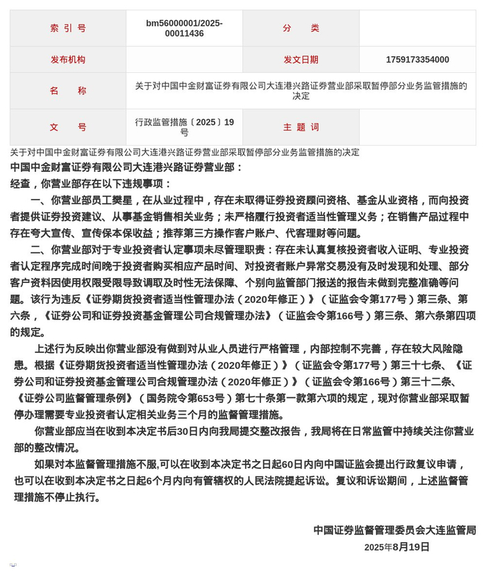 蓝鲸新闻12月1日讯,近日,中国证券监督管理委员会大连监管局发布行政监管措施决定书,剑指中国中金财富证券有限公司大连港兴路证券营业部。