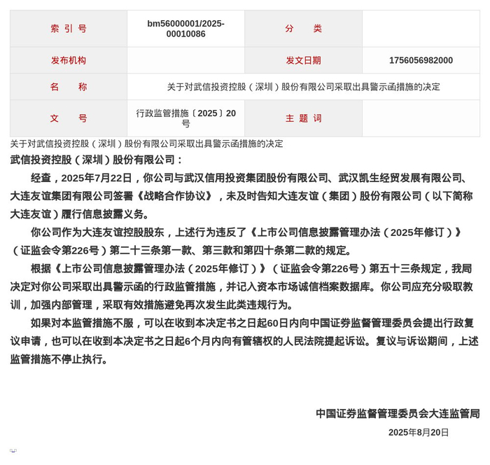 该决定指出,武信投资控股在2025年7月22日与武汉信用投资集团股份有限公司、武汉凯生经贸发展有限公司、大连友谊集团有限公司签署《战略合作协议》后,未及时告知大连友谊(集团)股份有限公司履行信息披露义务。