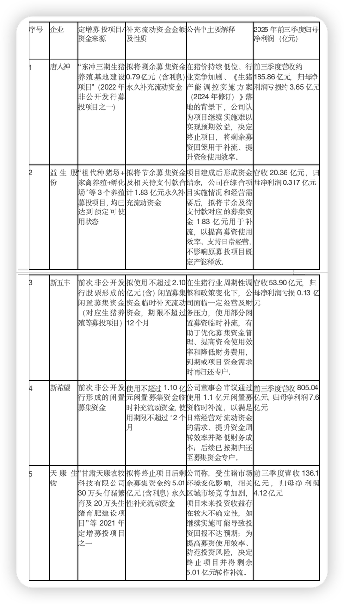蓝鲸新闻记者梳理上市公司公告发现,从唐人神(002567.SZ)到益生股份(002458.SZ),从新五丰(600975.SH)到新希望(000876.SZ),今年以来至少有5家上市猪企宣布将前次定增募投项目资金“挪作他用”,永久或阶段性补充流动资金。