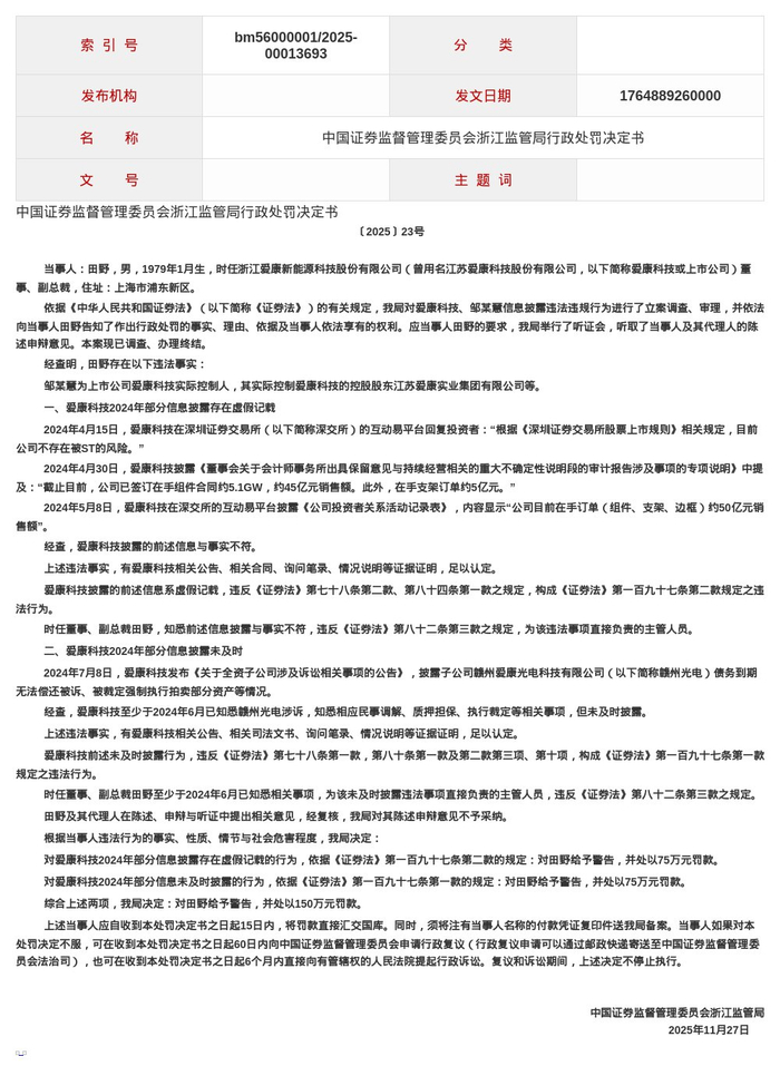 决定书显示,爱康科技2024年部分信息披露存在虚假记载;爱康科技2024年部分信息披露未及时。田野作为爱康科技的时任董事、副总裁,对上述违法行为负有直接责任,违反了《证券法》的相关规定。