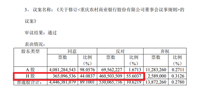 一样是议事规则,关于修订股东会议事规则,渝农商行H股股东并没有什么反对的声音,同意的比例为99.9886%。可见该行H股股东并不是赌气式投票,关键的分歧出现在修改章程以及董事会议事规则上。