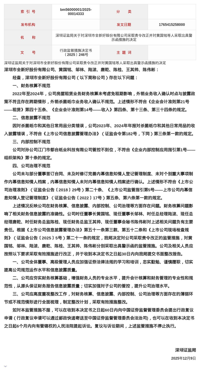 针对以上问题,深圳证监局决定对深圳市全新好股份有限公司采取责令改正的监管措施,对黄国铭、邹林、陆波、唐乾、陈桂、王其帅、陈伟彬分别采取出具警示函的监管措施。