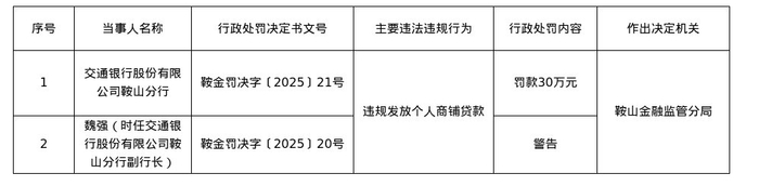 针对上述违法违规行为,国家金融监督管理总局鞍山监管分局对其罚款30万元;对魏强(时任交通银行股份有限公司鞍山分行副行长)警告。