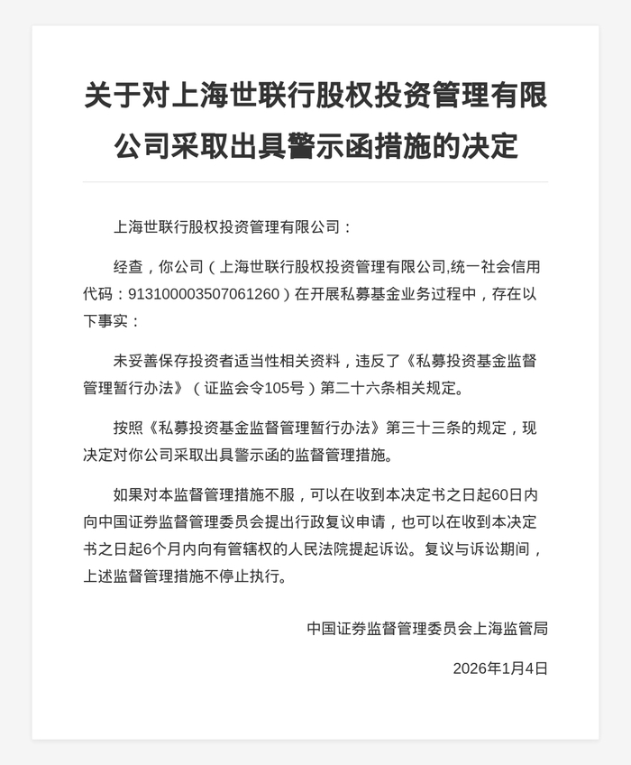 对此,中国证券监督管理委员会上海监管局现决定对上海世联行股权投资管理有限公司采取出具警示函的监督管理措施。