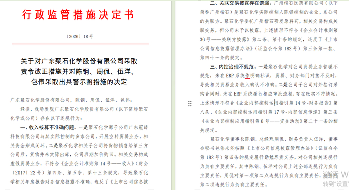 对此,广东证监局决定对聚石化学采取责令改正的监管措施,对陈钢、周侃、伍洋、包伟采取出具警示函的行政监管措施。
