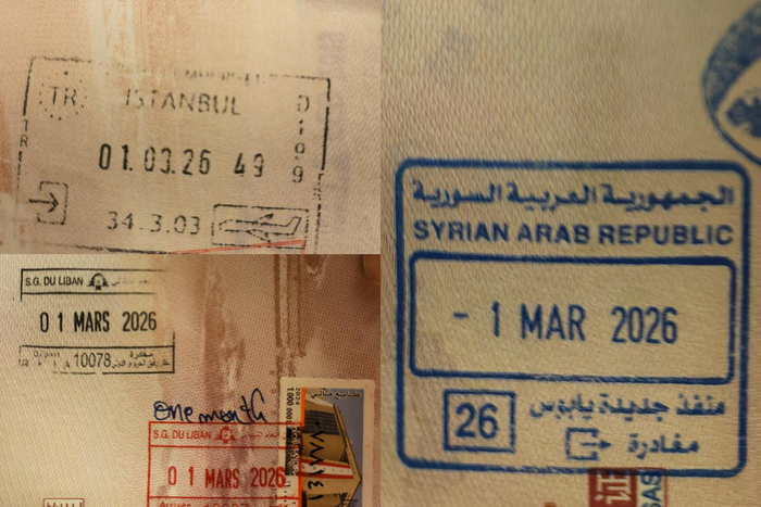 一日辗转中东三国,护照上的入境出境章;受访者供图蓝鲸新闻3月2日讯(记者 孙煜)中东局势生变,此时正在土耳其最大城市——伊斯坦布尔等候回国航班的赵女士告诉蓝鲸记者:“此前被困叙利亚首都大马士革,辗转多地来到伊斯坦布尔”。