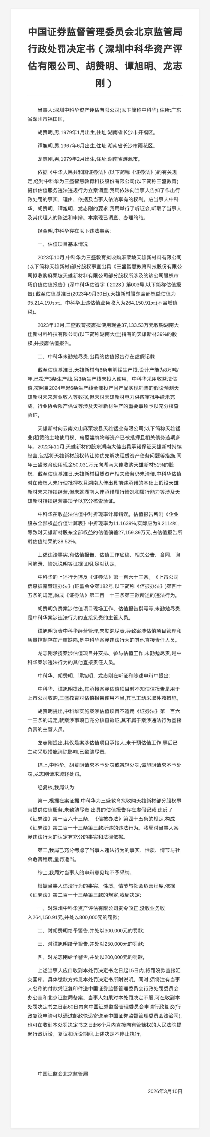 对此,中国证监会北京监管局决定对深圳中科华资产评估有限公司责令改正,没收业务收入264,150.91元,并处以80万元的罚款;对胡赞明给予警告并处以30万元的罚款;对谭旭明给予警告并处以25万元的罚款;对龙志刚给予警告并处以20万元的罚款。