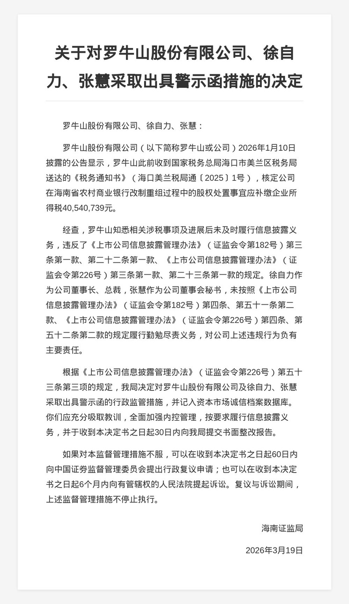 对此,海南证监局决定对罗牛山股份有限公司及徐自力、张慧采取出具警示函的行政监管措施,并记入资本市场诚信档案数据库。