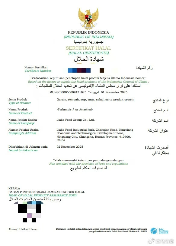 近日,加加食品成功获得印度尼西亚官方BPJPH清真认证,标志着其产品正式获得进入印度尼西亚市场的准入资格。这是继今年6月加加食品打入马来西亚市场后,在海外拓展中取得的又一重大突破。