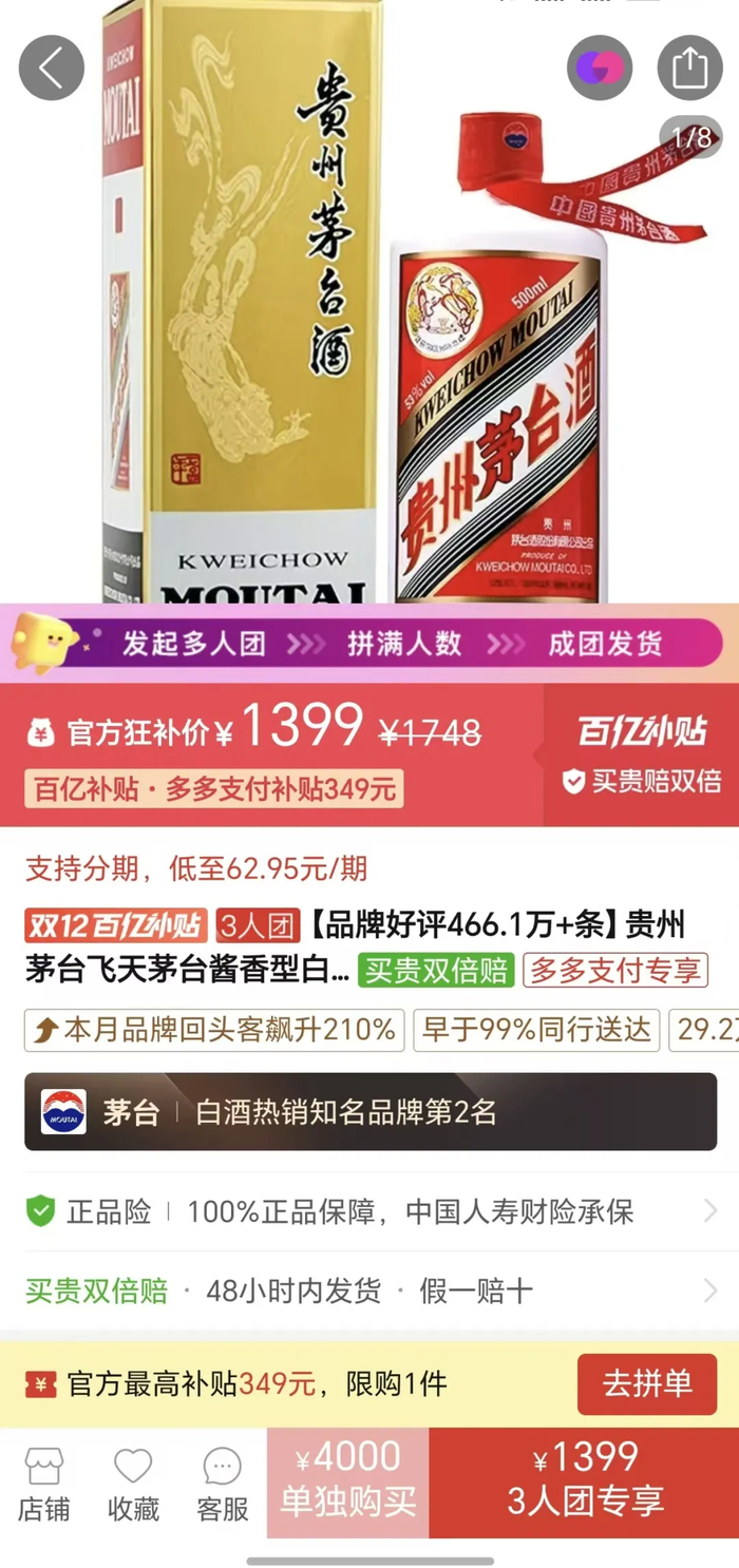 除了股价,零售终端的价格也处于全面降价中,“飞天茅台”的零售价已从21年最高点3000+跌到1499元/瓶,PDD百亿补贴价格更是降至1399元。