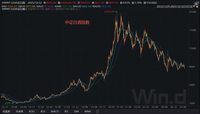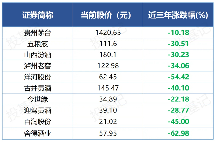 前两天,行业标杆“飞天茅台”的股价已跌到1400左右,相对来说,茅台跌幅已经算很小了,近3年,截至2025.12.12,白酒市值前十的酒企也是跌幅惨重,几乎在30%以上。