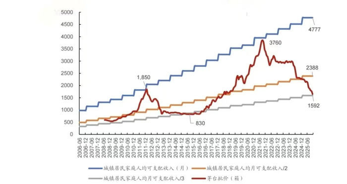 因此,从中长期来看,飞天茅台的批价围绕城镇居民月人均可支配收入的1/2波动,底线接近1/3位置,而当前批价已触及底部位置。