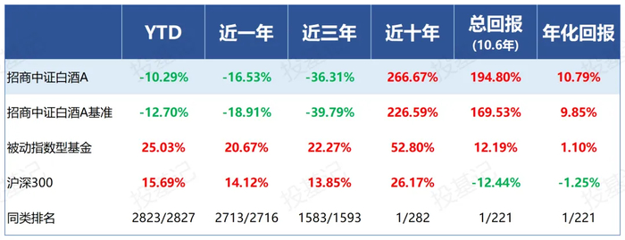 长期来看,近10年,招商中证白酒A累计回报达266%,大幅超越被动指数型基金和沪深300,收益还是很可观的。