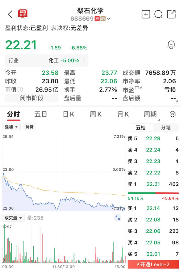 聚石化学市值26.95亿元。