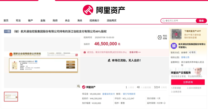 2025年7月7日,航天通信控股集团股份有限公司发布公告称,其持有的浙江信航支付有限公司(简称“信航支付”)49%股权的首次公开拍卖因无人参与竞拍而流拍。