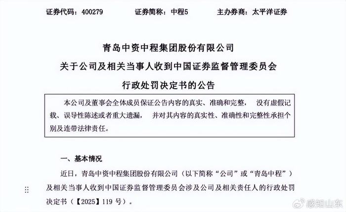 10月31日,青岛中资中程集团股份有限公司(下称“青岛中程”)发布公告称,近日,青岛中程及相关当事人收到中国证券监督管理委员会涉及公司及相关责任人的行政处罚决定书(【2025】119号)。该行政处罚决定书显示,青岛中程以及相关责任人因为2017年至2021年年报财务数据造假和重大诉讼未披露等合计被罚2060万元。