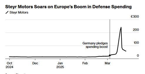 为坦克和舰艇提供动力的的斯太尔,去年10月以每股14欧元的定价完成定向增发后登陆法兰克福交易所,恰逢2025年前夕军工投资热潮。其股价上周最高触及240欧元,较发行价飙升1614%。