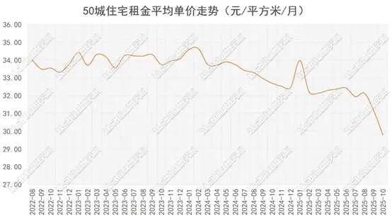 数据来源:同花顺,观点指数整理2025年10月,50个城市住宅租金单价降至29.78元/平方米/月,环比跌幅从9月的3.06%扩大至4.39%,同比跌幅也从5.48%加深至8.91%。