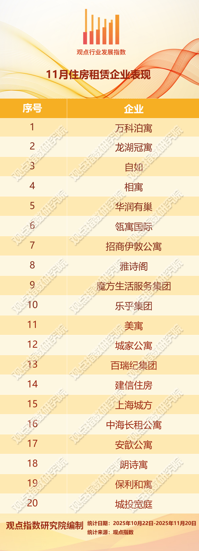 数据来源:观点指数不完全统计值得一提的是,10月20日,上海市政府印发《新时代城市建设者管理者之家项目认定和运营管理规定(试行)》,明确自2025年11月1日起施行,规范通过保障性租赁住房遴选方式筹措的相关项目。此次新规构建了“遴选-认定-改造-运营-复核”的七环节全周期管理体系,每个环节均明确刚性标准,确保项目从筹办到运营的全链条规范。