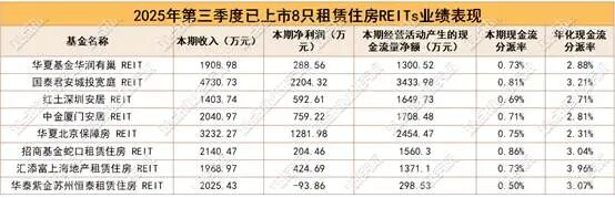 公募REITs层面,期内已上市的8只住房租赁REITs先后披露了2025年第三季度业绩表现。