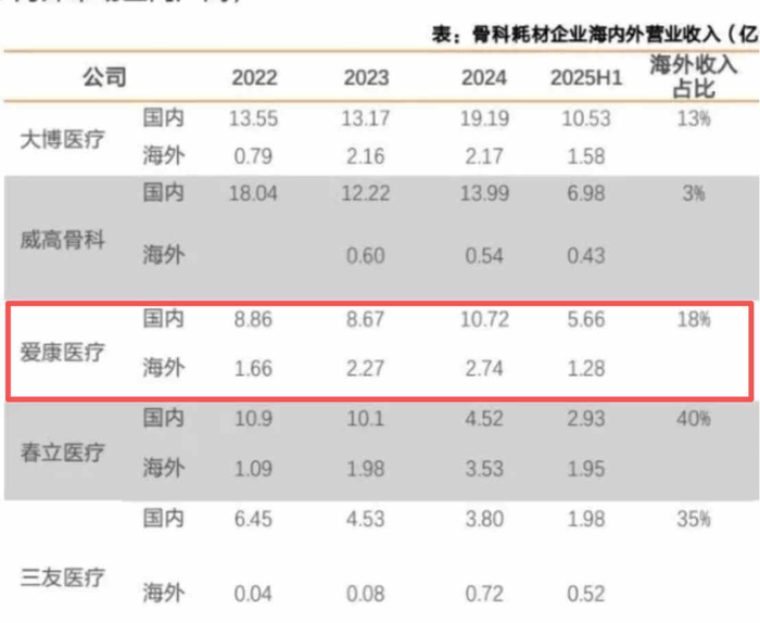 以年内股价涨幅相对较高的春立医疗为例,其是国内较早一批率先出海的国产骨科耗材企业之一,很早就开始进行自有品牌和OEM品牌同步出海策略。随着积极开拓国际市场业务,高速增长的海外收入已成为其重要收入来源。今年上半年,春立医疗的海外收入占比已达4成。相较之下,爱康医疗则依然将业务重心放在国内,今年上半年爱康医疗的海外收入占比为18%,虽然表现在头部5家企业中位列第三,但依然与春立医疗和三友医疗存在较大差距。