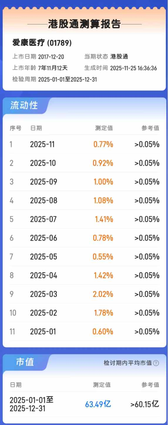 据智通财经APP数据显示,恒生指数和港股通下一轮定期调整时间在明年3月,检讨结果公布时间在2月25日,检讨周期则为2025年1月1日至2025年12月31日。目前爱康医疗该检讨周期内日平均市值为63.49亿港元,仅较目前61.15亿港元市值门槛高出2.34亿港元。考虑到现已时至11月末,距离港股通最新一轮调整考察期结束仅有约1个月时间,因此爱康医疗需要保证当前市值稳定,以便不会在新一期港股通调整中出局。