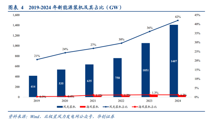 “十四五”仍处于萌芽阶段,截至2024年海风装机仅为全国总装机比例的1.2%,开发前景较为可观,看好海风未来成长潜力。
