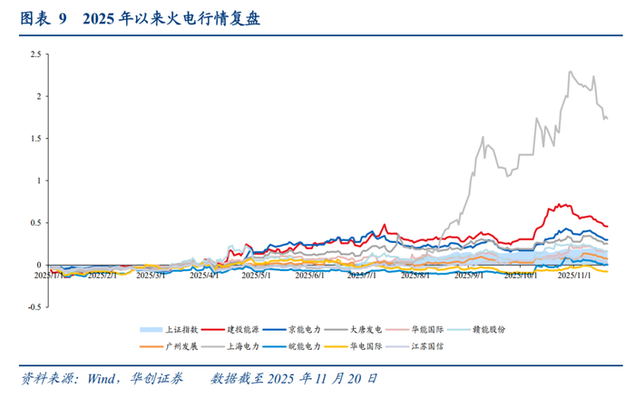 2025年,以建投能源、京能电力等为代表的业绩释放标的均跑赢上证指数,获得较好的相对收益。2026年长协电价有望企稳,当前煤价的阶段性反弹一定程度上打消了明年电价大幅下滑的预期。煤价尘埃落定之后,火电明年的业绩预期或将逐步明朗。此外,2026年容量电价明年或将系统性上调,助力火电从周期走向公用事业。参考25年火电公司盈利预测及24年分红水平,测算可得京能电力、申能股份、建投能源、浙能电力、广州发展以及内蒙华电的股息率均超过5%,已经逐渐具备性价比。