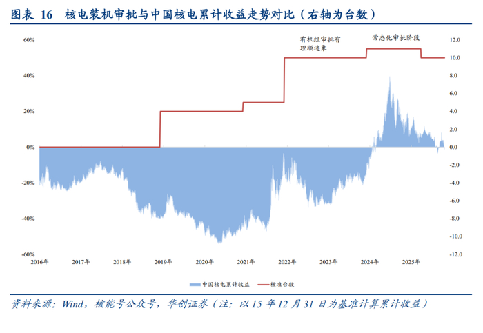 久期和确定性的博弈。核电成长性的回归和收益预期的稳定带来了核电的估值重塑,25年核电新增机组落地进一步明确了远期成长性。展望26年,如果市场风险偏好再度回落,则核电或许会迎来更多增量资金的关注。
