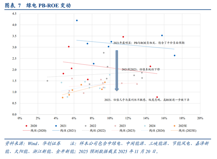 基本面仍然有压力,更看好对绿电边际向好的定价。今年8月以来,绿电补贴回款节奏显著加快,欠补问题有望解决。此外,绿电的估值体系混沌,23年的PB-ROE曲线斜率已经近乎为零,即无论ROE高低,都给予近似的PB,失锚的背后或是估值体系重构的强预期;24~25年,PB-ROE曲线的斜率逐步回归为向上倾斜,表明行业整体估值体系或逐渐重构。