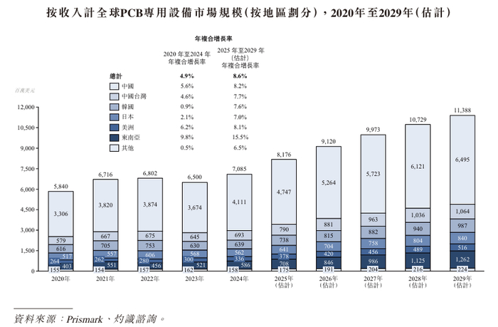 PCB专用生产设备的主要开发区域市场包括中国、中国台湾省、日本、韩国和美洲,截至2024年,该等地区合计占据全球市场规模约89.5%的份额。2020年至2024年,该等区域年复合增长率分别为5.6%、4.6%、0.9%、2.1%及6.2%。