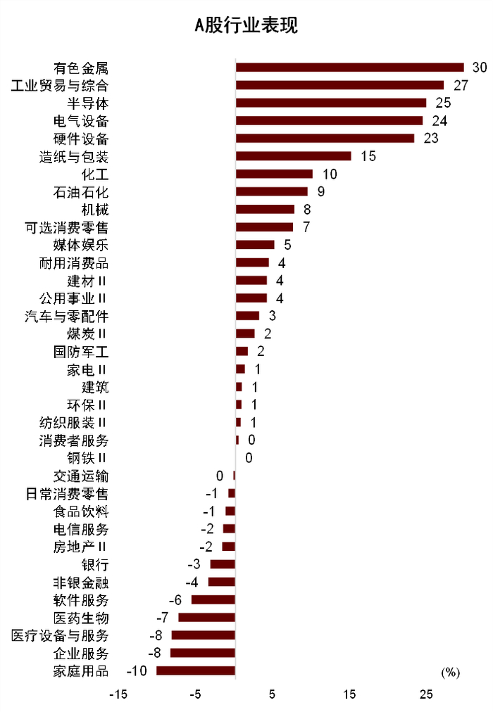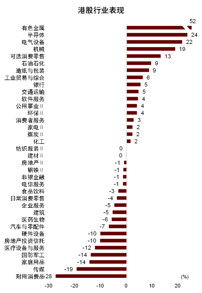 我们在此前发布的研报中认为,在AH比较新范式下,考虑到A股增量资金入市、国际货币秩序重构带动人民币资产重估、“反内卷”等政策更利好相关板块占比较高的A股,A股弹性将优于港股。报告发布至今,A股和港股市场表现基本符合预期(图表1):1)从整体和成长风格表现上,A股均跑赢港股。8月18日至12月12日,A股市场,上证指数涨5.2%,沪深300涨9.0%,代表科技成长风格的创业板指和科创50分别涨26.0%、22.5%;港股市场,恒生指数涨2.8%,恒生科技指数涨1.7%。2)分行业看,A股和港股的领涨行业相似,有色金属、半导体、电气设备均涨幅居前(图表2、图表3)。