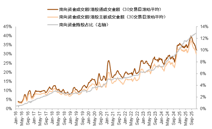 海外方面:海外贸易政策风险和流动性预期有所反复,对港股影响更大。港股外资占比较高,相比A股更容易受到海外因素影响,包括海外流动性、国际贸易政策、地缘局势等。1)流动性方面,美联储9、10、12月连续降息三次、且新任美联储主席的高预期候选人态度偏鸽,但美联邦政府停摆导致数据发布延后、10月和12月降息伴随偏鹰表态等因素导致降息预期有所反复;年底日央行加息预期升温,市场对套息交易逆转可能引发流动性冲击有所担忧。2)贸易政策方面,10月中美贸易摩擦阶段性升温,同期A股港股均出现短线波动,但在四月冲击的前例后,A股市场风险偏好扰动相对更小、表现出的韧性更强。从摩擦短线升级到中美吉隆坡经贸磋商(10月3日-26日),上证指数+1.7%,恒生指数-4.1%。