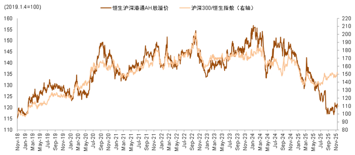 往后看,我们认为A股中期有望继续延续优势。1)基本面方面,AI明年有望逐步进入产业应用兑现阶段,基础设施层面关注算力、光模块、云计算等,尤其是国产方向;应用端关注机器人、消费电子、智能驾驶和软件应用等。A股覆盖较多的硬件领域或仍有望显现相对优势,但在估值提升较多之后需关注业绩兑现。2)流动性方面,我们认为A股市场将继续保持活跃,未来几个月到期的较长期限银行理财有望活化入市,中长期资金入市规模也将稳步提升。3)海外方面,中金此前研报中认为,10月中美元首会谈后,中美贸易关系进入新阶段,虽然是“脆弱的平衡”,但仍有助于尾部风险下降,进一步催化国际货币秩序重构、中国资产重估和人民币地位提升。整体而言,我们认为A股相比港股未来一段时间在流动性上仍有相对优势,国际货币秩序重构或继续推动全球资金再配置、人民币资产重估,A股中期有望继续跑赢港股。