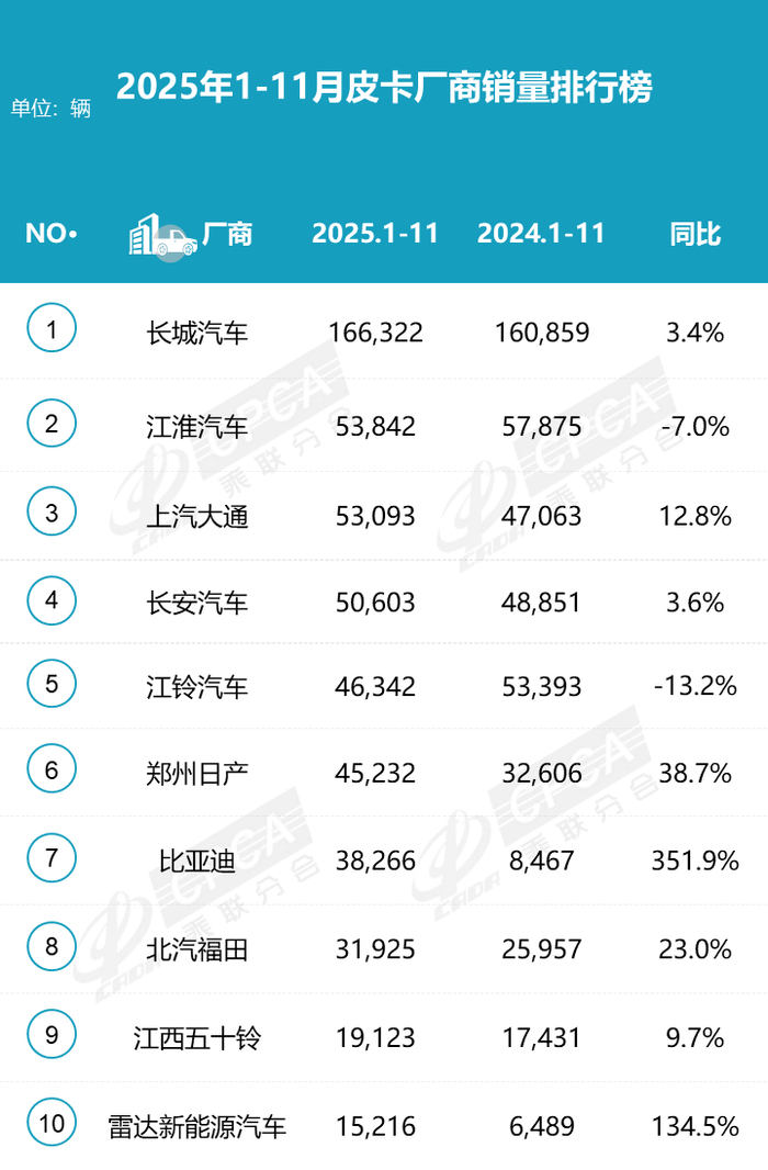 智通财经APP获悉,乘联分会发布2025年11月皮卡厂商批发销量排名快报。2025年11月份全国皮卡市场批发销售5.6万辆,同比增长18.8%,环比上月增长16.8%,处于近5年的高位水平。2025年1-11月份皮卡市场批发销售53.7万辆,同比增长12.1%。2025年11月份皮卡生产为5.2万辆,同比增长8%,处于近5年的中高位水平。2025年1-11月份皮卡市场生产52.7万辆,同比增长14.5%。