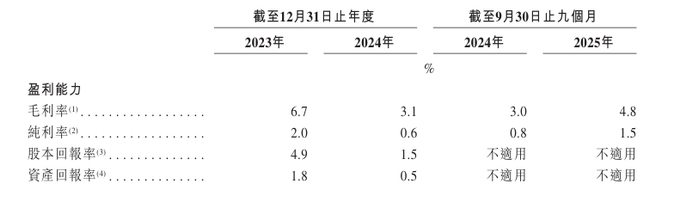 于2023年、2024年及2025年截至9月30日止九个月,该公司毛利率分别为6.7%、3.1%、4.8%。