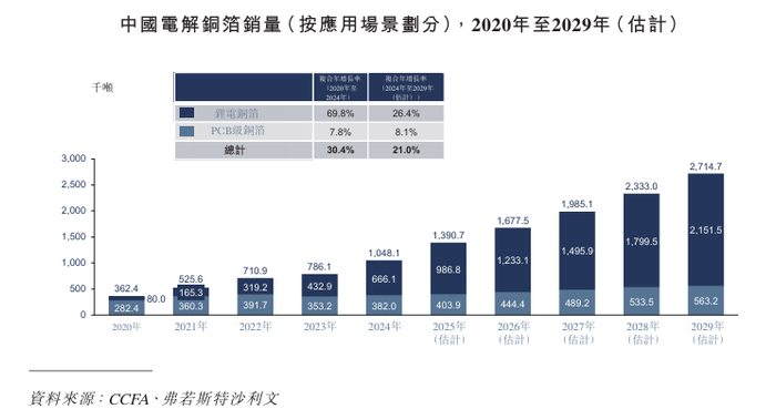 全球储能电池铜箔销量由2020年的1.83万吨增至2024年的22.34 万吨,复合年增长率为86.9%。未来,预期全球储能电池铜箔销量将于2029年进一步增长至100.38万吨,2024年至2029年的复合年增长率为35.1%。