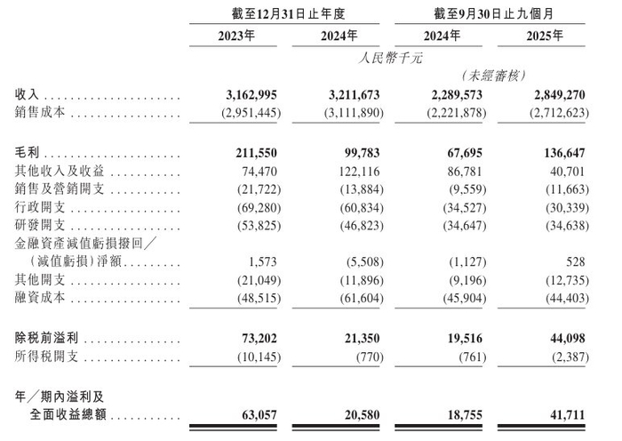 于2023年、2024年及2025年截至9月30日止九个月,该公司年/期内溢利及全面收益总额分别为6305.7万元、2058万元、4171.1万元人民币。