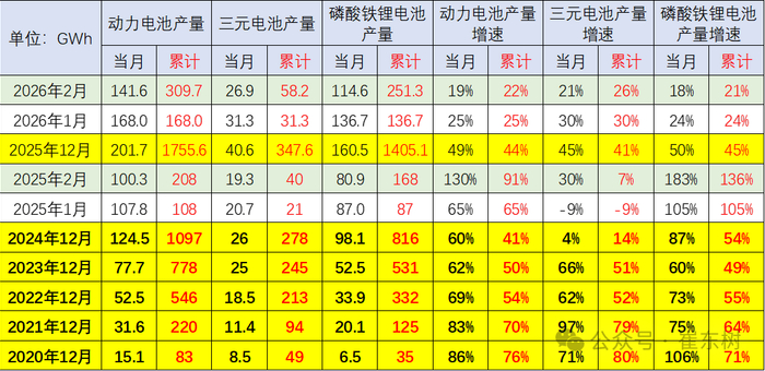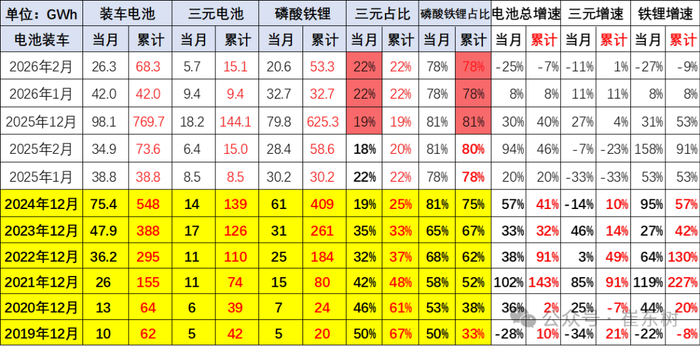动力电池装车的需求增长是超强增速的。2019年需求增长10%;2020年内销车型动力电池装车64GWh,需求增长2%;2021年动力电池装车155GWh,需求增长143%;2022年装车295GWh,需求增长91%;2023年装车388GWh,需求增长32%;2024年锂电池装车548GWh,同比增长41%;2025年锂电池装车770GWh,同比增长40%。2026年2月锂电池装车26GWh,同比下降25%。