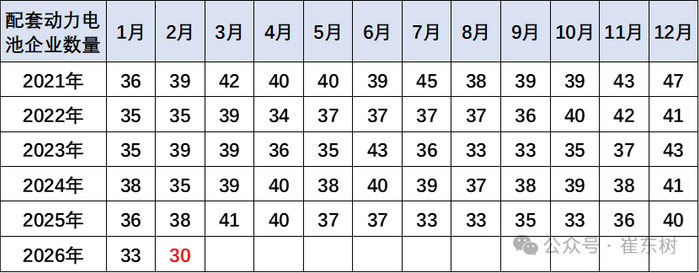 过去几年,电池市场的竞争格局并没有发生明显的变化,。2026年2月配套电池企业是达到30家的低位。由于动力电池市场的技术进步相对比较缓慢,而规模增长特征相对明显,加之储能等新产业需求发展。因此,电池企业获得了较强的生产和装车数量增长的特征。