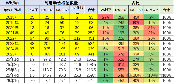 纯电动车目前主力电池能量密度区间在125到160之间。尤其2026年1季度表现比较突出的是140到160的电池占比达到40%,同比上升13个百分点。