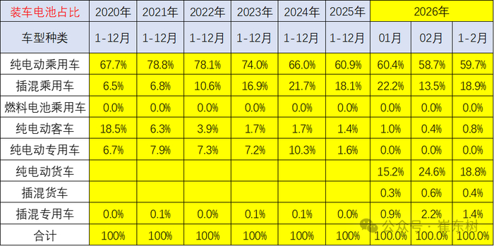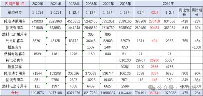 2026年2月新能源车国内市场的装车37万台、同比下降47%,其中纯电动乘用车23.6万台、同比下降41%;插混乘用车10万台、同比下降61%;纯电动货车2. 7万台,这样的产量数据分化严重。