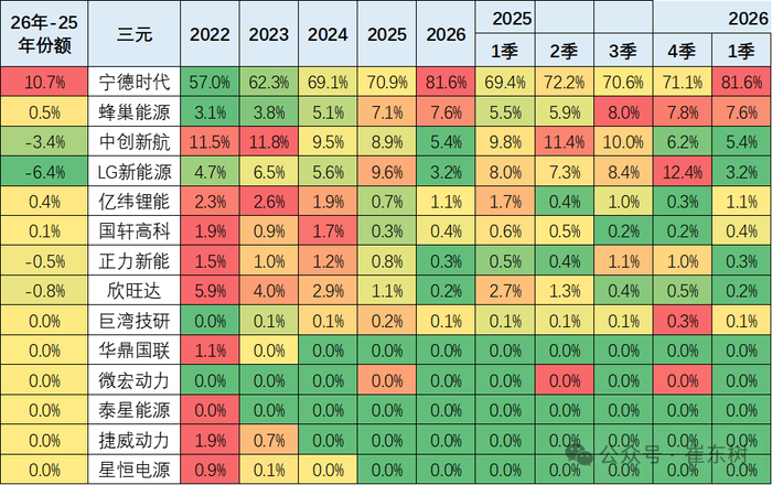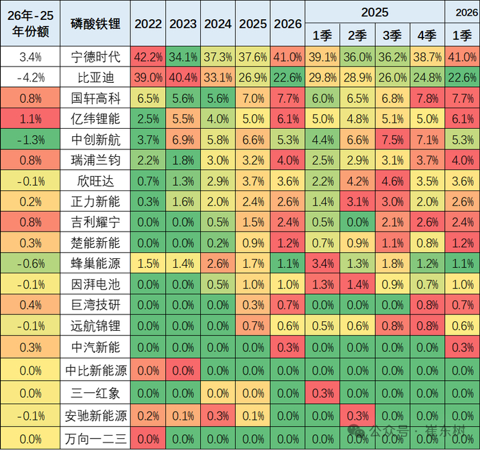 磷酸铁锂电池的产品差异优势明显。比亚迪相对优秀,但今年年初处于调整期。宁德时代的磷酸铁锂电池的占比份额从2024年已经反超比亚迪。2026年比亚迪持续下行,份额较2025年下降4.2个百分点。亿纬锂能和国轩高科表现较强。欣旺达(300207.SZ)、瑞浦兰钧(00666)、中汽新能的提升明显。