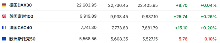 2. 截至发稿,德国DAX指数涨0.04%,英国富时100指数涨0.26%,法国CAC40指数涨0.20%,欧洲斯托克50指数跌0.10%。