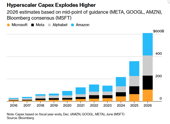 如上图所示,超大规模云计算厂商们资本支出大幅飙升——2026年估算基于业绩指引中值(Facebook母公司Meta、谷歌母公司Alphabet、亚马逊)以及经济学家们一致预期数据(汇总对于微软的一致预期)